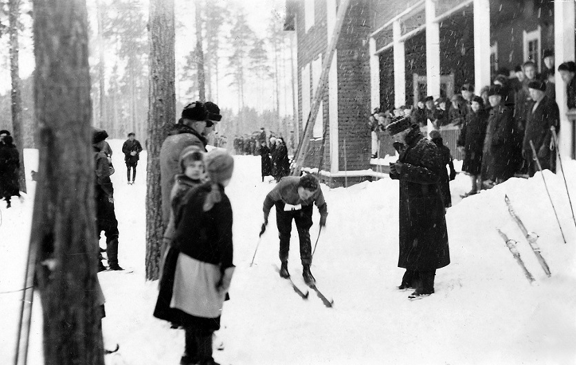 Jännitys oli kieltämättä suuri. Kajahti voimakas: n y t ja pari poikaa lähti lykkimään, mutta yhdellä oli juuri villapaita pussina päässä koettaessa kiskoa sitä pois. Hän oli ihan hätääntyä, mutta saatiinhan se villapaita miesvoimalla irti, ja rohkaistiin, että on sitä vielä taipaletta yrittää edellekin. Pahimmin oli erään toisen asia, hänellä kun ei ollut vielä suksiakaan tiedossa, mutta hän lähti juoksemaan toivoen matkalla jostain talosta saavansa sukset. Hän pääsi melkein heti toisten edelle ja käytyään kolmen jokitörmällä olevan talon pihassa löysi viimein sukset, jotka tosin olivat eri paria, mutta kävivät vallan täydestä, koska niitä kuitenkin huonon kelin vuoksi oli kannettava.