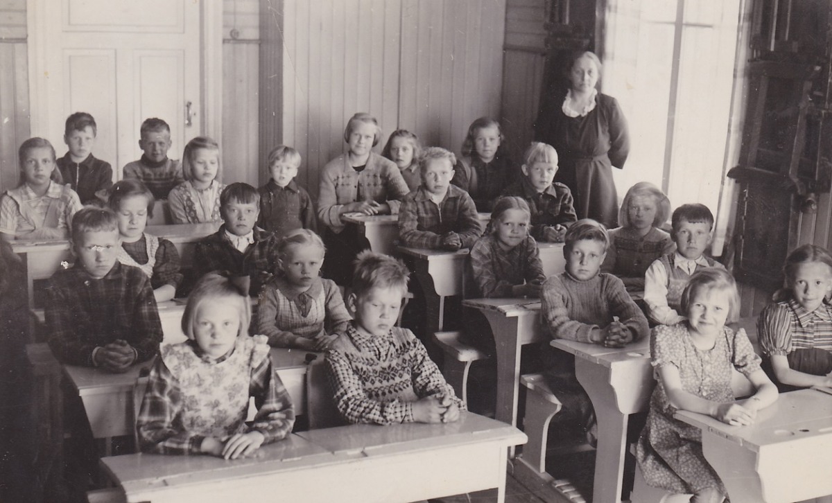 Pieni poika takana on Jorma Viitavaara, opettajan poika; silloin oli tapana että joistakin perheistä oli alle kouluikäinen lapsi ”kuunteluoppilaana”.