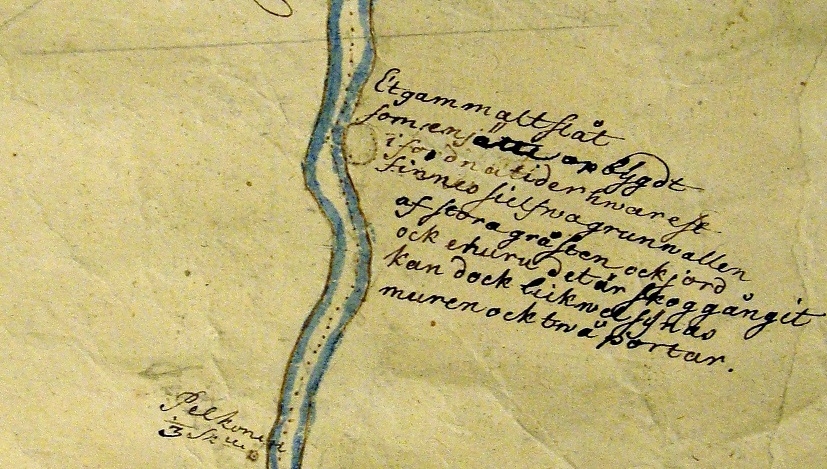 Et gammalt slåt som en jätte opbygdt i fordna tider hwareft[er] finnes sielfwa grunwallen af stora gråsten ock jord ock ehuru det är skoggångit kan dock lickwel synas muren ock twå portar. – Vanha linna, jonka jättiläinen on rakentanut muinaisina aikoina, jossa on itse perustus suurista harmaakivistä ja maasta, ja vaikka se on metsittynyt voi kyllä kuitenkin näkyä muuri ja kaksi porttia. Maanmittari Vikarin kartta vuodelta 1739. 1