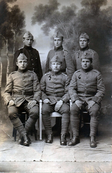 Oheisessa valokuvassa on Karppilan talon poika Yrjö Karppila (s. 1899) armeijan tiedonantokurssilla Lappeenrannassa 23.06.1920, edessä vasemmalla vieressään muhoslainen Väinö Mustonen (klikkaa kuvaa).