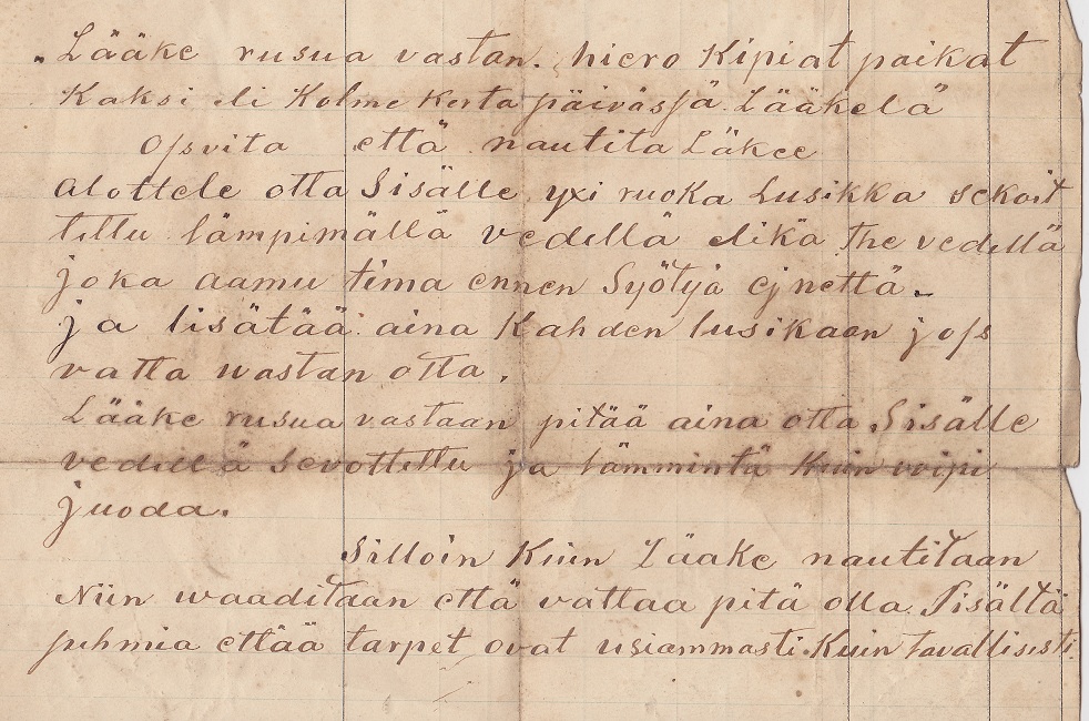 Hiero kipiät paikat kaksi eli kolme kertaa päivässä lääkelä. Osvita että nautita läkee alottele otta sisälle yxi ruoka lusikka sekoitettu lämpimällä vedellä elikä the vedellä joka aamu tima ennen syötyä ejnettä. Ja lisätään aina kahden lusikaan joss vatta wastan otta. Lääke rusua vastaan pitää aina otta sisälle vedellä sevottettu ja lämmintä kuin voipi juoda.