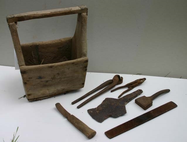 Laatikkomallinen pakki, jossa kantokahva. Korkeat päädyt, jotka kahva liittää yhteen. Matalammat sivut. Koottu nauloilla. Pakissa metalllisia työkaluja, mm. pihdit, hohtimet, raspi, vuolupuukko jne.
