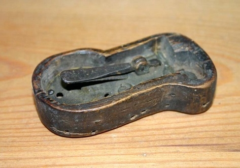 Vieterilaitteen avulla toimiva, pientä kirvestä muistuttava terä, puinen kotelo. Puu, metalli. 6 cm x 2,5 cm