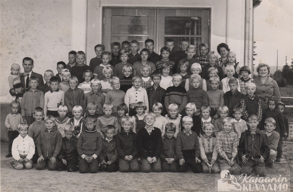 Opettajana alaluokilla 1.-2. oli Alli Karppinen ja kuvassa on hänen kaksi lastaan Marjukka ja Seppo, jotka eivät vielä tainneet kuvaa otettaessa olla koulussa muuten kuin ”eskarissa”. 3.-4. luokan opettajana oli Anja Anttila. 5.-6. luokkaa opetti ja koulun johtajaopettajana oli Antero Alikoski, hänenkin ”eskarilaiset” Arto ja Jari pääsivät kuvaan. Koulun keittäjänä oli Katri Ahvenlampi, hän ei valitettavasti ole kuvassa.