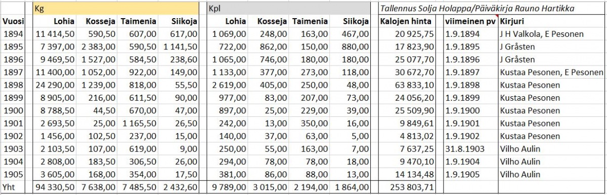 Kokosin Hartikka-Rintamäessä olleen lohipäiväkirjan lukemia. Ikävä kyllä vanhemmat päiväkirjat ovat joutuneet hukkaan. Klikkaa kaaviota isommaksi niin näet luvut paremmin. Kossi = yhden merivuoden ikäinen kudulle palaava lohi (lähes aina koiras). Viimeinen päivä = syyskesän viimeinen päivä jolloin pato on koettu. 1