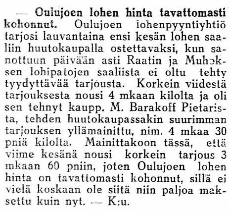 Oulujoen lohenpyyntiyhtiö myi kaikki Oulujoesta ensi kesänä pyyntiaikana saatavat 4 1/2 kiloa painavammat lohet siten, että kauppias Wladimir Barakoff Pietarista on saanut Raatin padolla pyydetyt ja Mikael Barakoff Muhoksen padolla pyydetyt lohet. Kuitenkin yhteensä 500 kiloa Raatin ja 100 kiloa Muhoksen padolla on varattu yksityisille ja myydään ne huutokaupalla, jos ostajia ilmaantuu. Lohenpyynti alkaa kesäkuun keskipaikoilla. Irtonaisten tukkien lauttausaika loppuu nimittäin 12 pnä ja tukkilauttain laskemisaika 15 pnä kesäkuuta, jonka jälkeen lohen pyyntöön ryhdytään.