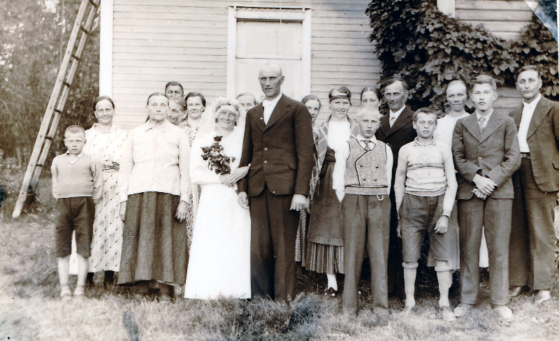 Edessä vas. Eero Ervasti, Anna Kontu, Briitta Vesa, vihkipari Esteri ja Heikki Vesa, Seppo Ervasti, tuntematon paimenpoika ja Esko Ervasti. Takana vas. Väinö ja Hanna Ervasti, ?, ?, ?, Anni Vesa kansallispuvussa, ?, Emil Vesa, Esteri ja Kalle Ontero.