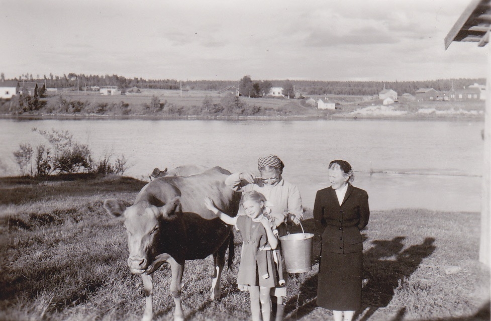 Kiitos Ojalan Eilalle tästä hauskasta kuvasta kertomuksineen – kesäinen ilta-aurinko paistaa kuvan henkilöiden silmiin! Heräsi kuitenkin kysymys – miksi lehmät vietiin eteläpuolelle jokea? Oliko siellä enemmän sopivaa laidunta? Minkä rakennuksen nurkka näkyy oikeassa laidassa? Soljan huom.