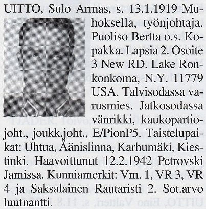 Sulo Armas Juhonpoika Uitto (s. 13.1.1919 Muhosperä Nurkkala, k. 15.12.1999, haudattu Calverton, Suffolk County, New York, USA) puoliso Bertta Mirjam Kopakka (s. 30.7.1920 Ylivieska, k. 11.5.2007 Suffolk County, New York, USA), perheessä kaksi lasta.