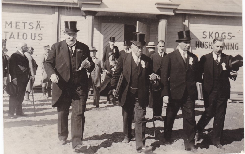 Heimosen albumissa on myös kuvia Tampereelta ja luultavasti nimenomaan Tampereen maatalousnäyttelystä, jotka olivat 1922 sekä 1949. Jos Väinö olisi Svinhufvudin kanssa vuonna 1922 Tampereella hän olisi ollut tuolloin 21-vuotias. Kuvassa oleva tumma mies V. Heimoseksi epäilemämme, on mielestäni hiukan vanhempi. Kuvassa on mielenkiintoinen tämä rakennus, siinähän lukee Metsätalous. Väinö Heimonen on otettu 21.10.1947 Osuuskunta Metsäliiton 1 luokan jäseneksi. Liittykö tämä kuva hänen Metsäliiton toimintaansa?