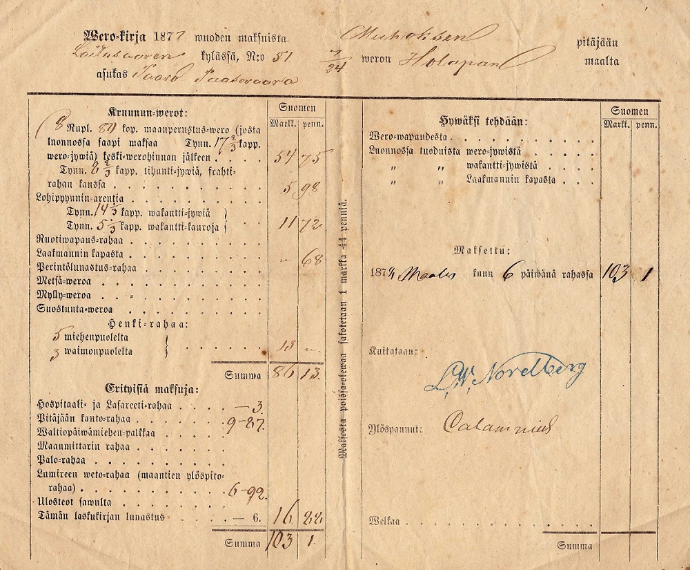 Kruununveroja siis yhteensä 86 Suomen markkaa ja 13 penniä